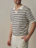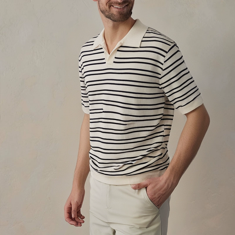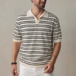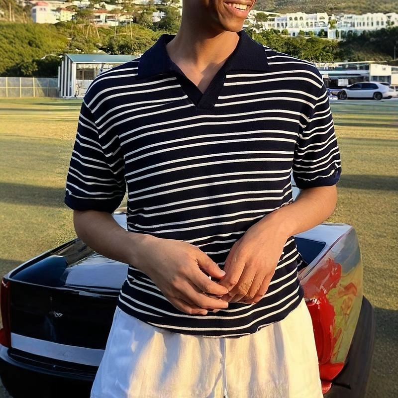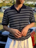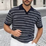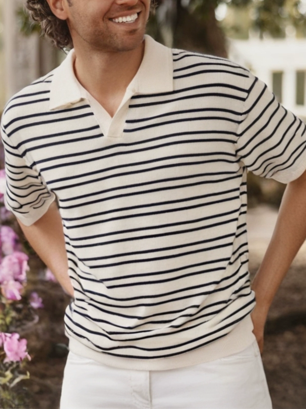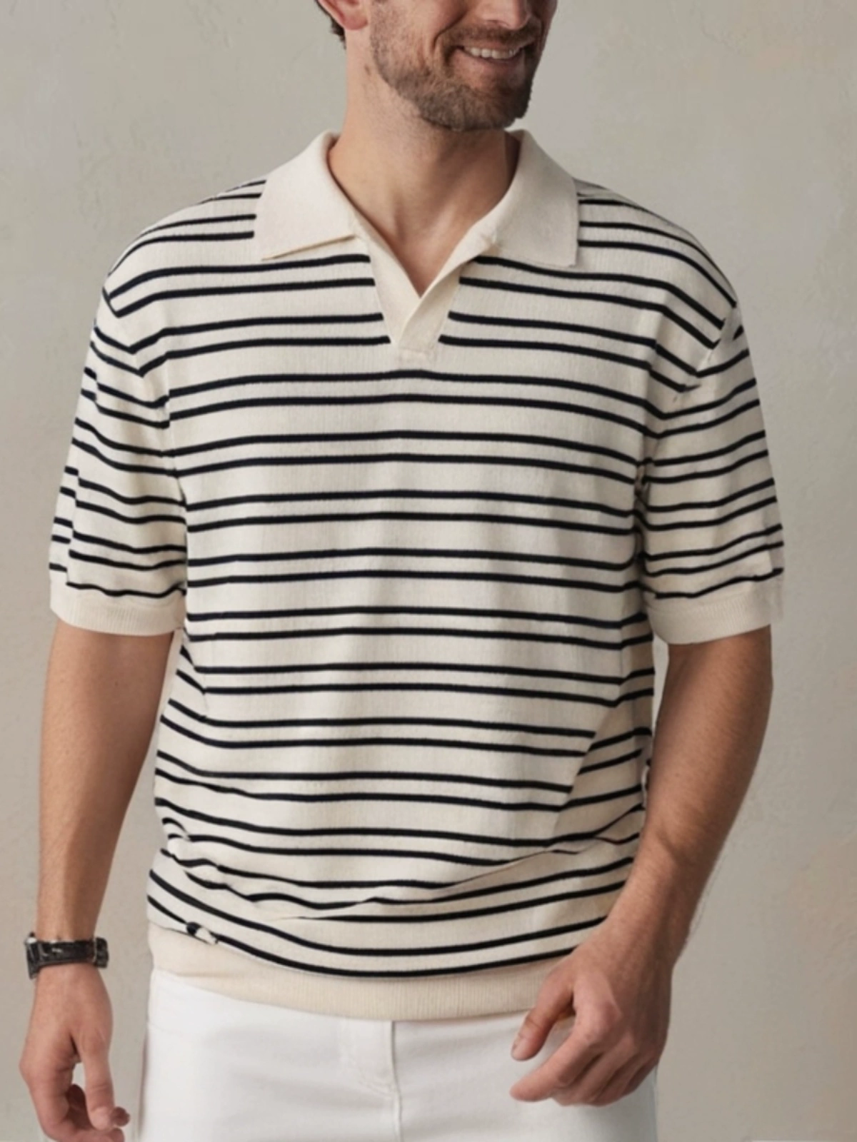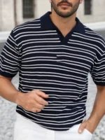 2025 summer V-neck ice silk striped polo shirt for men simple and fashionable lapel short-sleeved T-shirt Men T-Shirt
